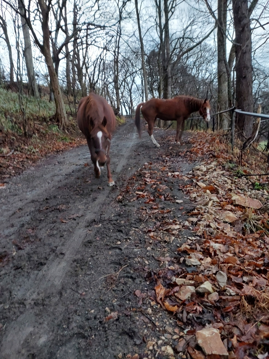 厩舎に帰って来るメルヴェイユとルレです。下が堅いのでゆっくりと歩いてきます。